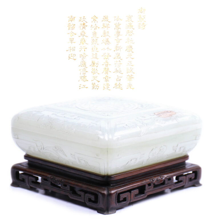 0449: Chinese White Jade Carved Box With Huang Hua Li Wood Stand