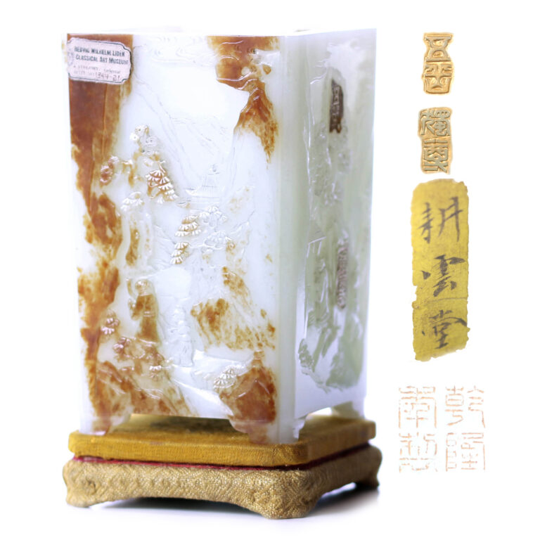 0461: Chinese White Jade Carved Brush Pot With Stand