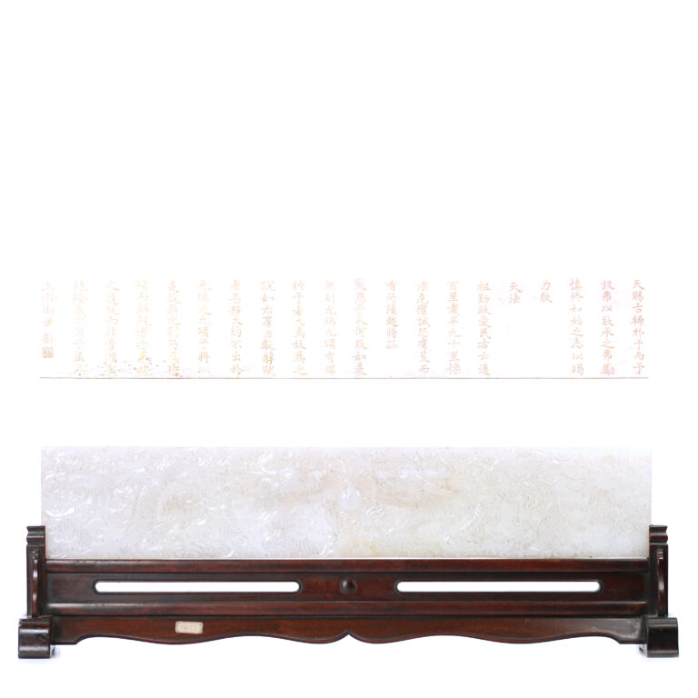 0474: Chinese White Jade Carved Plaque With Huang Hua Li Wood Stand