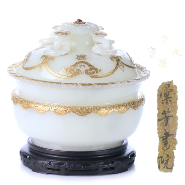 0477: Chinese White Jade Carved Jar With Cover, Inlaid 24K Pure Gold And Natural Ruby, With Zitan Hardwood Stand