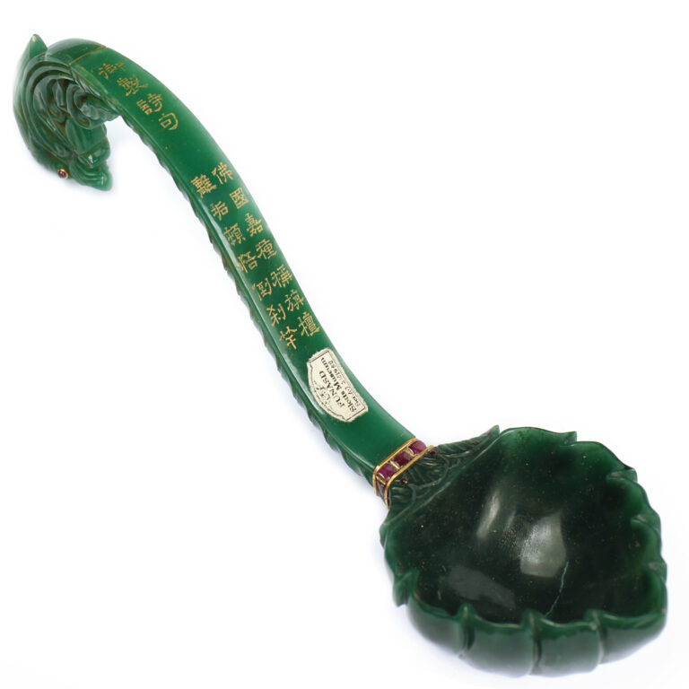 0478: Chinese Green Jade Carved Spoon Inlaid Pure Gold And Natural Rubies