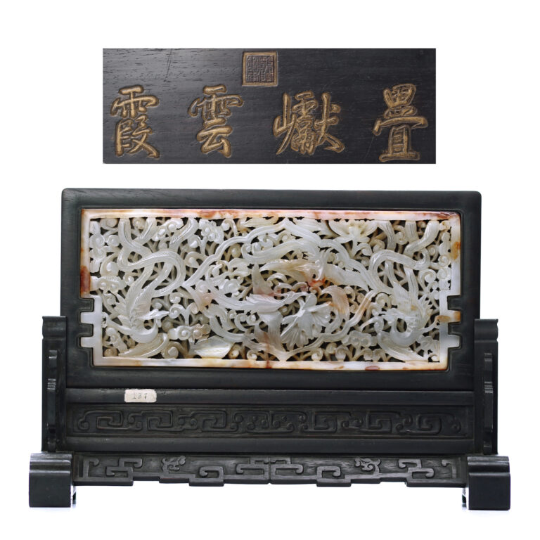 0493: Chinese Jade Carved Plaque Inlaid On Zitan Hardwood Frame