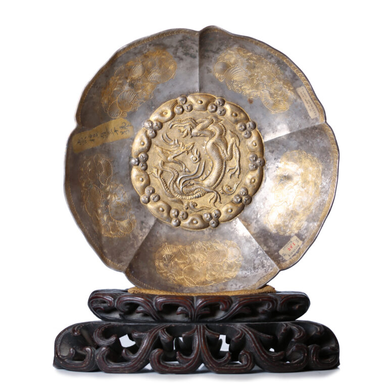 0526: Chinese Gilding Silver Carved Plate With Stand