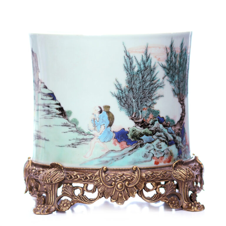 0539: Chinese Wu Cai Glazed Porcelain Brush Pot With Stand